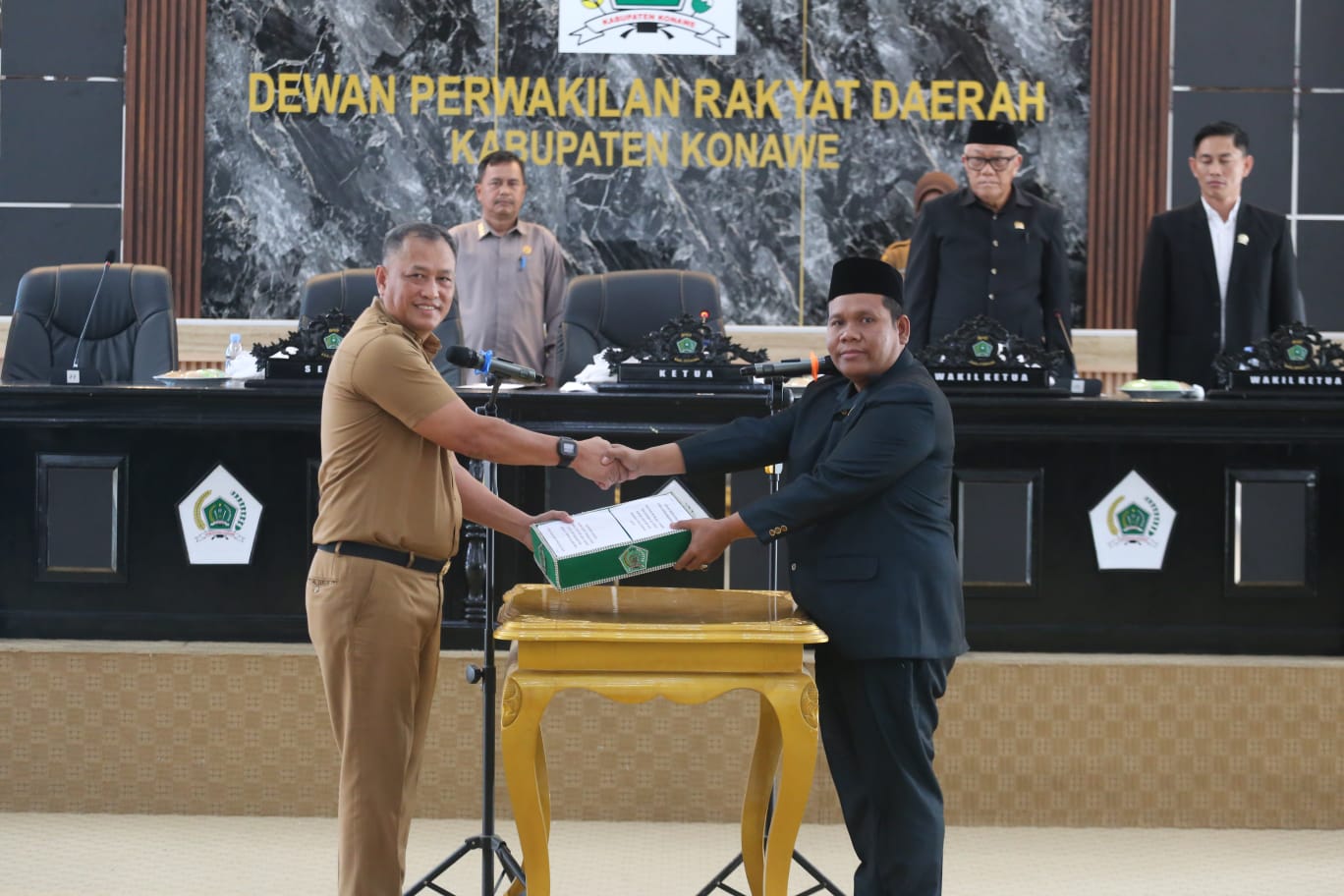 Sekda Kabupaten Konawe Ferdinand Sapan yang hadir mewakili Bupati Konawe, Yusran Akbar menyerah LKPJ tersebut dan diterima langsung oleh Ketua DPRD Kabupaten Konawe, I Made Asmaya.