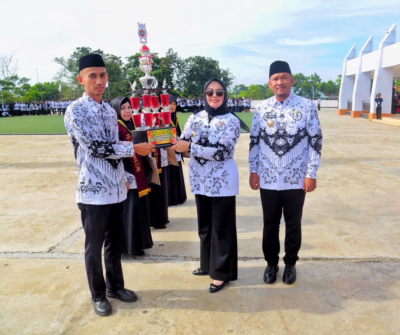 Di hadapan ratusan guru dari berbagai jenjang, Wali Kota Kendari Siska Karina Imran memimpin upacara dan membacakan sambutan Menteri Dikdasmen Prof. Abdul Mu‘ti.