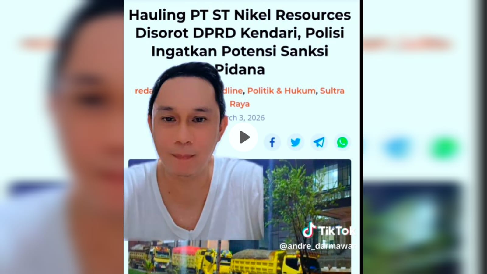 KIATNEWS : KENDARI – Praktisi hukum ternama di Sulawesi Tenggara, Andre Darmawan, menyoroti tajam carut-marut aktivitas pengangkutan (hauling) ore nikel yang dilakukan PT ST Nikel Resources menggunakan jalan umum di Kota Kendari. Ia menegaskan bahwa kasus Operasi Tangkap Tangan (OTT) dugaan pemerasan yang baru-baru ini mencuat hanyalah “puncak gunung es” dari serangkaian pelanggaran hukum yang jauh lebih sistemik.