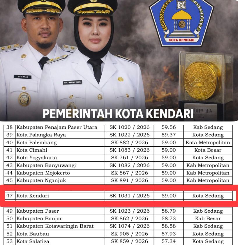 Berdasarkan Keputusan Menteri Lingkungan Hidup/Kepala Badan Pengendalian Lingkungan Hidup Nomor 126 Tahun 2026 tentang Penilaian Kinerja Pengelolaan Sampah Kabupaten/Kota Tahun 2025, Kota Kendari berada di posisi ke-47 dengan nilai 59,00. Capaian ini menjadi pukulan telak bagi Pemkot Kendari yang sebelumnya memiliki rekam jejak mentereng dengan 12 kali meraih Adipura, mulai dari era kepemimpinan Asrun-Musadar hingga masa jabatan Pj Wali Kota Muhammad Yusuf.