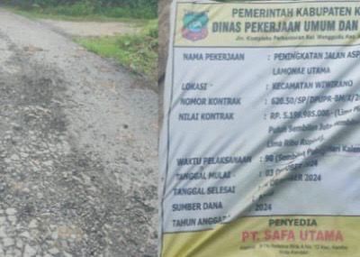 Diketahui, proyek pekerjaan jalan tersebut menelan anggaran negara sebesar Rp5.199.985.000. Pekerjaan dimulai sejak 3 Oktober 2024 dan bersumber dari APBD Konawe Utara Tahun Anggaran 2024.