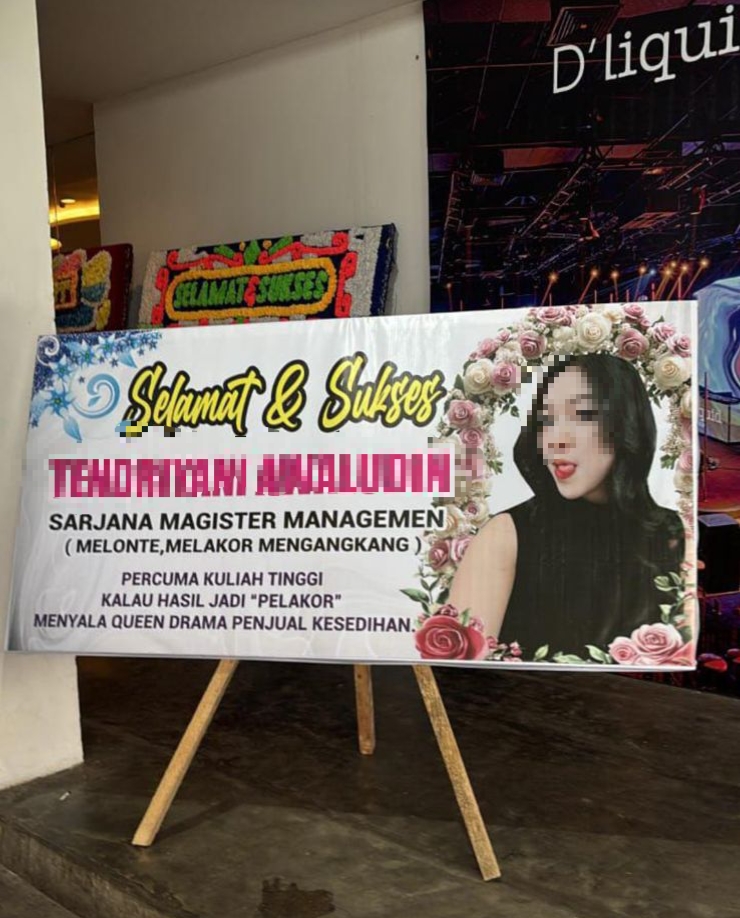 Selain kalimat sindiran, karangan bunga itu juga memuat foto wisudawati berinisial TA, yang diduga pelakor atau perempuan perebut suami orang.